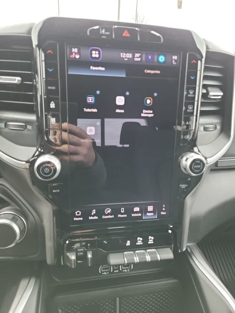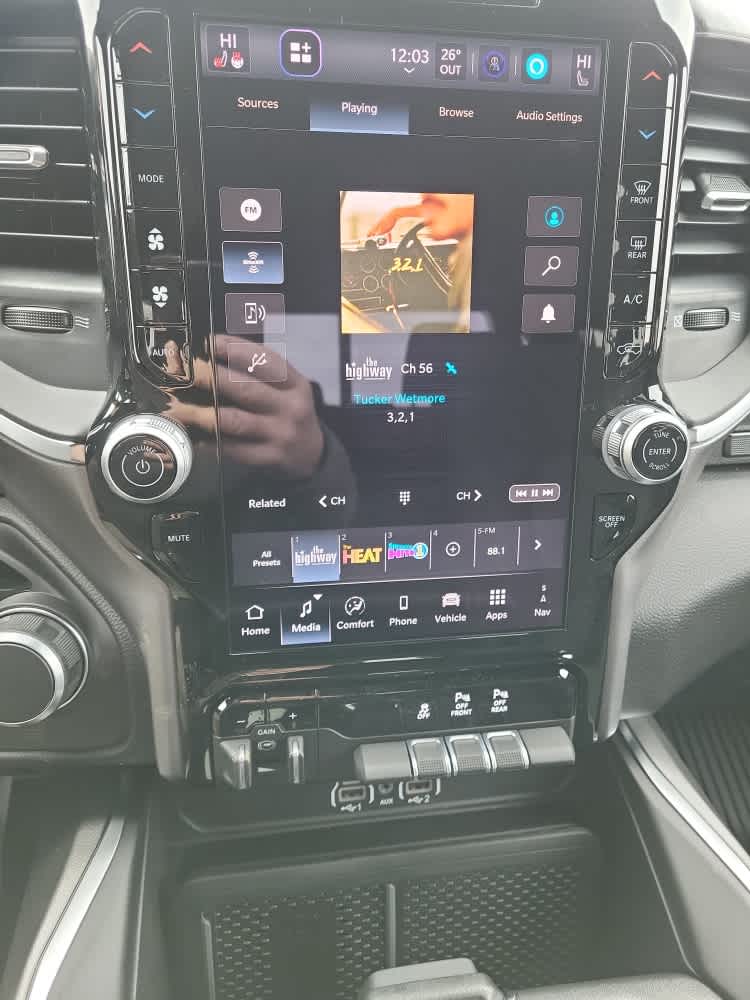 Active Noise Control System, Heavy Duty Engine Cooling, Passive Tuned Mass Damper, GVWR: 7,100 lbs, Dual Rear Exhaust w/Bright Tips, G/T Exhaust, 18 Aluminum Spare Wheel, SiriusXM Radio Service, Power Adjustable Pedals, Leather Wrapped Steering Wheel, 12 Touchscreen Display, Glove Box Lamp, Auto Power-Folding Mirrors, 115V Auxiliary Rear Power Outlet, Media Hub w/2 Charge Only USBs, Heated Front Seats, Security Alarm, Black Premium Power Mirrors, Premium Overhead Console, 9 Amplified Speakers w/Subwoofer, Disassociated Touchscreen Display, Body Color Fender Flares, Remote Tailgate Release, 115V Auxiliary Power Outlet, LED Dome Lamp w/On/Off Switch, Universal Garage Door Opener, 2nd Row In Floor Storage Bins, Sun Visors w/Illuminated Vanity Mirrors, LED Footwell Lighting, Rear Window Defroster, Rear View Auto Dim Mirror, Rear Power Sliding Window, GPS Navigation, Overhead LED Lamps, Wheels: 20 x 9 Aluminum Chrome Clad (WRK), Tires: 275/55R20 OWL All, Dome Dual LED Reading Lamp, Tires: 275/55R20 OWL All Season, Bridgestone Brand Tires, Accent Color Premium Power Mirrors, Exterior Mirrors w/Supplemental Signals, Black Headlamp Bezels, Exterior Mirrors Courtesy Lamps, Grille Black Surround Black Mesh, Auto Power-Folding Mirrors, Wheels: 20 x 9.0 Aluminum Painted Clad, Auto Dim Exterior Driver Mirror, Black Exterior Truck Badging, Anti-Spin Differential Rear Axle, Accent Color Door Handles, Accent Color Tailgate Handle, Black Interior Accents, Dual Exhaust w/Black Tips, Body Color Front Bumper, Body Color Rear Bumper w/Step Pads, Black Tail Lamp Bezels, RAM Grille Badge - Black, Black Painted Exterior Mirrors Caps, MOPAR Spray In Bedliner, MOPAR 4 Adjustable Cargo Tie-Down Hooks, Pick-Up Box Lighting, Exterior 115V AC Outlet, MOPAR BLACK TUBULAR SIDE STEPS, MOPAR FRONT & REAR RUBBER FLOOR MATS, TRANSMISSION: 8-SPEED AUTOMATIC (8HP75). Keyless Entry, Privacy Glass, Child Safety Locks, Electronic Stability Control, Bucket Seats.